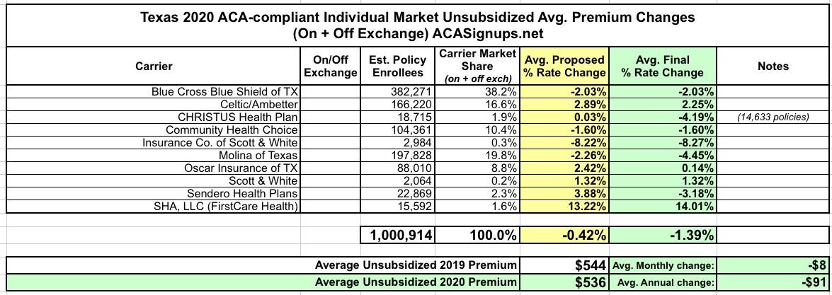 Since then, I've managed to find the enrollment data for the rest of the carriers as well...and yesterday CMS posted the final, approved 2020 rate changes, allowing me to run the complete, final, fully-weighted average. In the end rates in Texas are dropping by 1.4%: