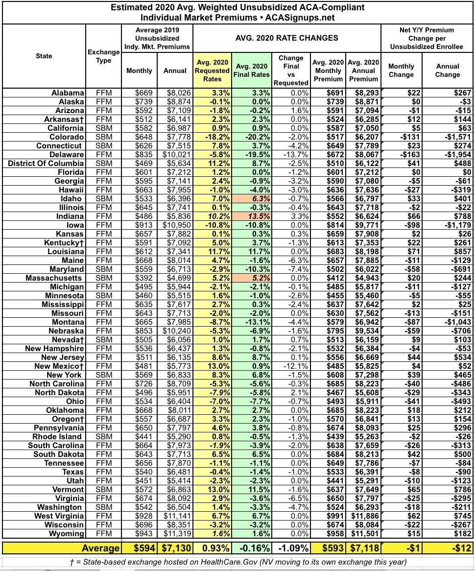 The final, approved average unsubsdized premiums for 2020 haven't changed from the requested rates--the weighted statewide average is a 6.7% increase.