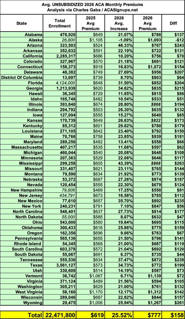 UPDATE 11/02/25: Annnnd that's that: With the final, approved rate filing decisions for the remaining states, here's what unsubsidized 2026 ACA individual market premiums look like for all 50 states +DC: +25.5% on average...the highest year-over-year gross rate hikes since the ACA exchanges launched in 2014.