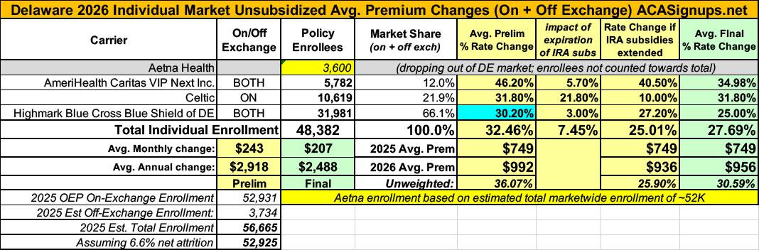 UPDATE 8/28/25: The Delaware Insurance Dept. has posted their approved rate changes for the individual market; they knocked AmeriHealth Caritas down by over 11 points and shaved 5 points off of Highmark, bringing the final weighted average increase down from 32.5% to 27.7%.