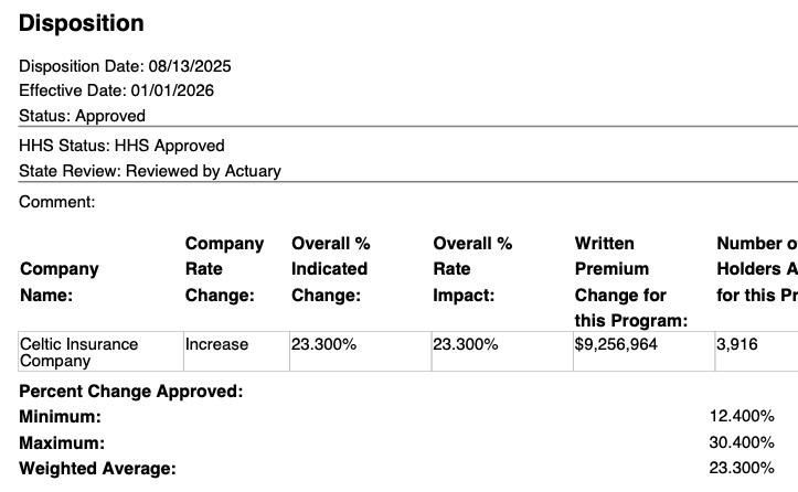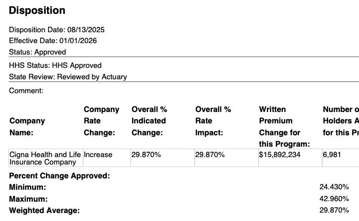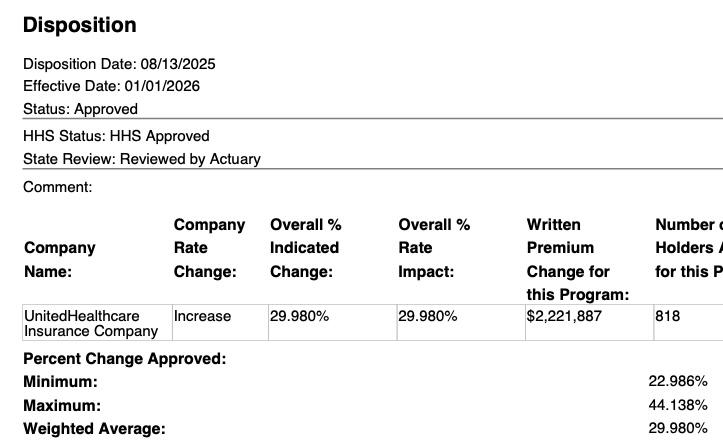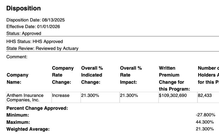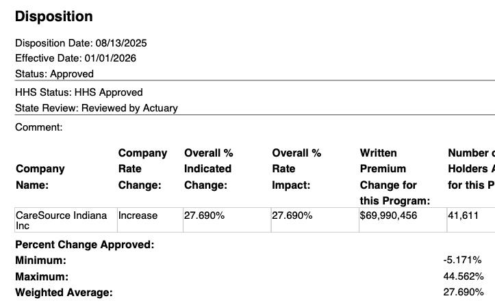 UPDATE 8/13/25: Hoo boy. As noted above, the IN DOI said they'd have the final 2026 rate filings by 8/15/25, and according to the federal rate review database, it looks like they've beaten that deadline by a week or so. Here's the preliminary rate hikes and what they've been changed to: