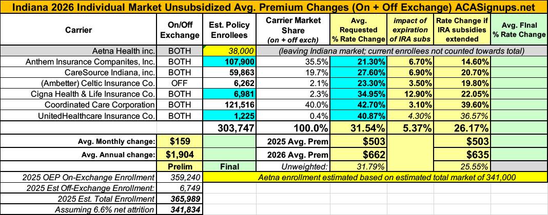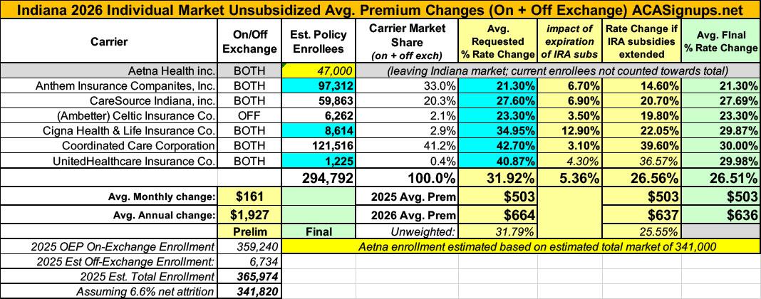UPDATE 8/17/25: The Indiana SERFF database has what appears to be the approved rate filings for individual market carriers, and the good news (relatively speaking) is that three of the carriers have had their rate hikes reduced significantly (Cigna, Coordinated Care and UnitedHealthcare). Anthem and Cigna also have slightly revised their estimated enrollment counts.