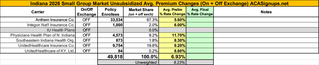 Unfortunately, the UnitedHealthcare filing doesn't seem to be available, so I've had to plug in an educated guess as to how many UHC enrollees Indiana has on their individual market. Since there are around 360,000 on-exchange enrollees, the UCH number has to be around 70,000 or so in order to put the grand total over that amount...except that doing so also makes the weighted average 2026 rate hike 23.5%, when the IN DOI clearly states that it's actually a bit lower, at 20.5%.