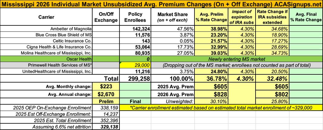 2026 Final Gross Rate Changes - Mississippi: +43.4%; ~330,000 enrollees facing MASSIVE rate hikes starting in January (updated)