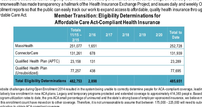 It's important to stress that this is not the final enrollment report for Massachusetts; it's the final daily report, which only includes the number of people determined eligible to purchase a private policy (Medicaid enrollees, however, are instant-activation; the number listed here is the number actually enrolled as of that day).