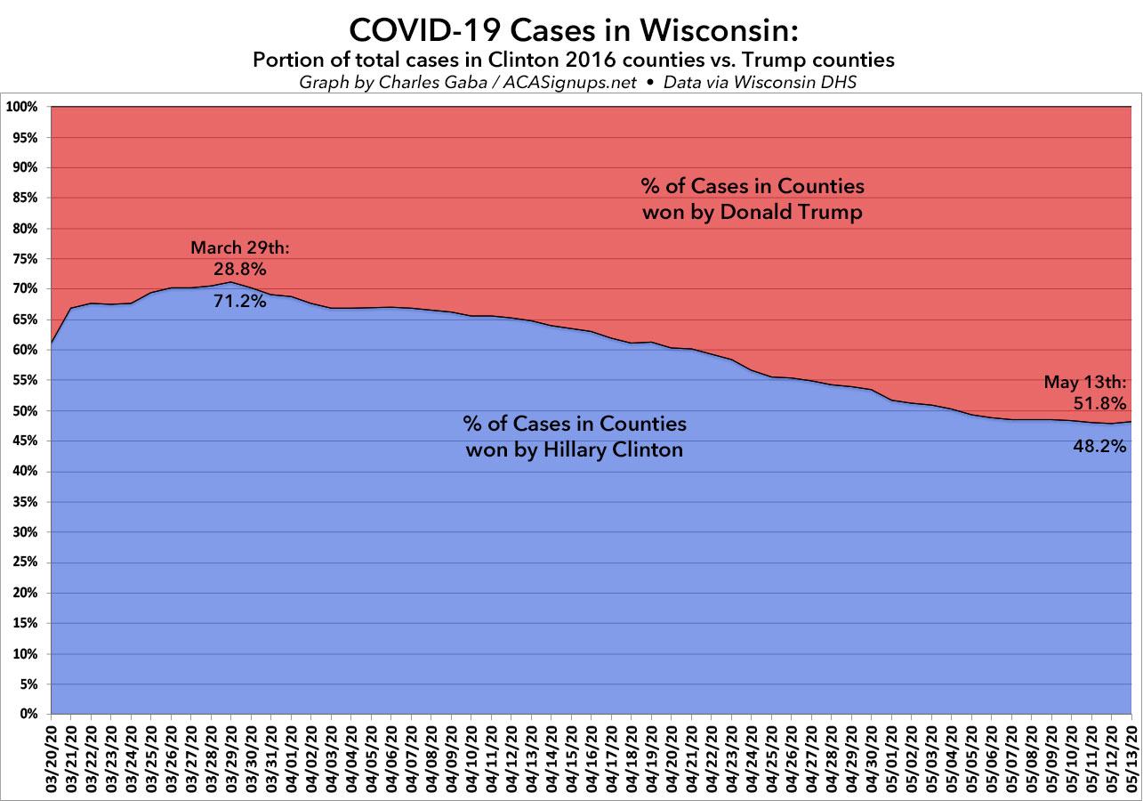 A few weeks ago, I posted a detailed analysis of how the COVID-19 virus has been spreading throughout Wisconsin. I noted that while the outbreak originally spread quickly in the more urban/blue-leaning areas, that has gradually changed over time, with the virus spreading to the rest of the state--including rural, conservative-leaning areas--at a faster rate while it slowed down in the urban areas.
